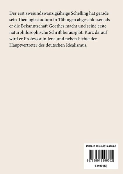 Der erst zweiundzwanzigjährige Schelling hat gerade sein Theologiestudium in Tübingen abgeschlossen als er die Bekanntschaft Goethes macht und seine erste naturphilosophische Schrift herausgibt. Kurz darauf wird er Professor in Jena und neben Fichte der Hauptvertreter des deutschen Idealismus.