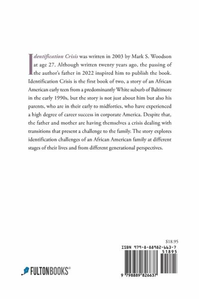 Identification Crisis was written in 2003 by Mark S. Woodson at age 27. Although written twenty years ago, the passing of the author's father in 2022 inspired him to publish the book. Identification Crisis is the first book of two, a story of an African American early teen from a predominantly White suburb of Baltimore in the early 1990s, but the story is not just about him but also his parents, who are in their early to midforties, who have experienced a high degree of career success in corporate America. Despite that, the father and mother are having themselves a crisis dealing with transitions that present a challenge to the family. The story explores identification challenges of an African American family at different stages of their lives and from different generational perspectives.