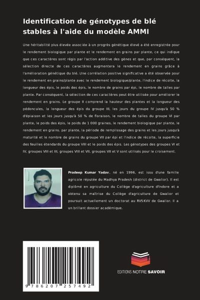 Une héritabilité plus élevée associée à un progrès génétique élevé a été enregistrée pour le rendement biologique par plante et le rendement en grains par plante, ce qui indique que ces caractères sont régis par l'action additive des gènes et que, par conséquent, la sélection directe de ces caractères augmentera le rendement en grains grâce à l'amélioration génétique du blé. Une corrélation positive significative a été observée pour le rendement en grains/plante avec le rendement biologique/plante, l'indice de récolte, la longueur des épis, le poids des épis, le nombre de grains par épi, le nombre de talles par plante. Par conséquent, la sélection de ces caractères peut être utilisée pour améliorer le rendement en grains. Le groupe II comprend la hauteur des plantes et la longueur des pédoncules, la longueur des épis du groupe III, les jours du groupe IV jusqu'à 50 % d'épiaison et les jours jusqu'à 50 % de floraison, le nombre de talles du groupe VI par plante, le poids des épis, le poids de 1 000 graines, le rendement biologique par plante, le rendement en grains. par plante, la période de remplissage des grains et les jours jusqu'à maturité et le nombre de grains du groupe VII par épi et l'indice de récolte, la superficie des feuilles étendards du groupe VIII et le poids des épis. Les génotypes des groupes VI et IV, groupes VIII et III, groupes VIII et VII, groupes VII et V sont utilisés pour le croisement.