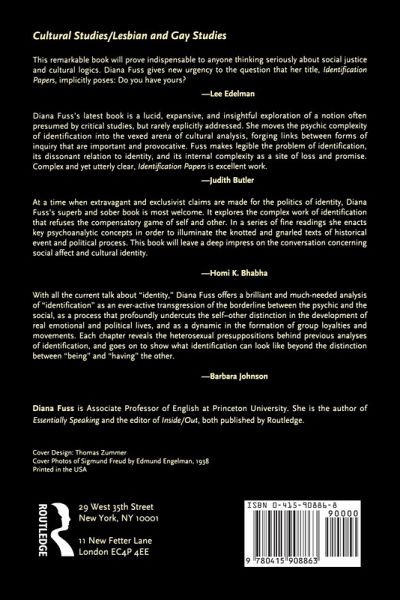 Identification Papers closely examines the three principal figures -- gravity, ingestion, and infection -- that psychoanalysis invokes to theorize identification. Fuss then deconstructs the psychoanalytic theory of identification in order to open up the possibility of more innovative rethinkings of the political.