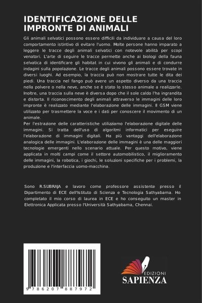 Gli animali selvatici possono essere difficili da individuare a causa del loro comportamento istintivo di evitare l'uomo. Molte persone hanno imparato a leggere le tracce degli animali selvatici con notevole abilità per scopi venatori. L'arte di seguire le tracce permette anche ai biologi della fauna selvatica di identificare gli habitat in cui vivono gli animali e di condurre indagini sulla popolazione. Le tracce degli animali possono essere trovate in diversi luoghi. Ad esempio, la traccia può non mostrare tutte le dita dei piedi. Una traccia nel fango può avere un aspetto diverso da una traccia nella polvere o nella neve, anche se è stato lo stesso animale a realizzarle. Inoltre, una traccia sulla neve è diversa dopo che il sole caldo l'ha ingrandita e distorta. Il riconoscimento degli animali attraverso le immagini delle loro impronte è realizzato mediante l'elaborazione delle immagini. Il GSM viene utilizzato per trasmettere la voce e i dati per conoscere il movimento di un animale.Per l'estrazione delle caratteristiche utilizziamo l'elaborazione digitale delle immagini. Si tratta dell'uso di algoritmi informatici per eseguire l'elaborazione di immagini digitali. Ha più vantaggi dell'elaborazione analogica delle immagini. L'elaborazione delle immagini è una delle maggiori tecnologie emergenti nello scenario attuale. Per questo motivo, viene applicata in molti campi come il settore automobilistico, il miglioramento delle immagini, la robotica, i giochi, le soluzioni specifiche per i problemi, la produzione e l'interfaccia uomo-macchina.
