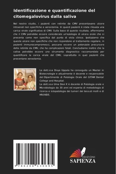 Nel nostro studio, i pazienti con retinite da CMV presentavano ulcere intraorali non specifiche e xerostomia. In questi pazienti è stata rilevata una carica virale significativa di CMV. Sulla base di questo risultato, affermiamo che il CMV potrebbe essere considerato un'eziologia di ulcera orale che si presenta come non specifica dal punto di vista clinico. Ipotizziamo che queste ulcere non specifiche che non rispondono al trattamento regolare, in pazienti immunocompromessi, possano essere un potenziale precursore della retinite da CMV, che ha complicazioni fatali. Concludiamo inoltre che la saliva potrebbe essere uno strumento diagnostico raccomandato per quantificare la carica virale del CMV, soprattutto in quei pazienti che presentano xerostomia.
