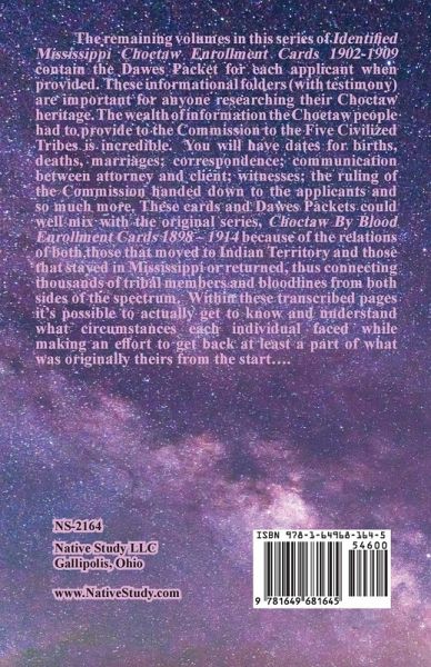 A unique never before transcribed series for the Identified Mississippi Choctaw Enrollment Cards, 1902-1909, including a copy of the original and a transcribed copy of the Treaty of Dancing Rabbit Creek, a copy of the Dawes Final Roll of Mississippi Choctaws, September 25, 1902, an example of a Dawes Packet showing how the Choctaw had to prove their heritage even seventy years after Dancing Rabbit Creek. The people within this series are the original descendants from the early 1800's to the present-day Mississippi Choctaw. There is a brief, heartfelt history for the people within these pages even reaching the very souls of the Mississippi Band of today. The remaining volumes in this series contain the Dawes Packet for each applicant, when provided. These informational folders (with testimony) are important for anyone researching their Choctaw heritage. The wealth of information the Choctaw people had to provide to the Commission to the Five Civilized Tribes is incredible. You will have dates for births, deaths, marriages; correspondence; communication between attorney and client; witnesses; the ruling of the Commission handed down to the applicants and so much more. These cards and Dawes Packets could well mix with the original series, Choctaw By Blood Enrollment Cards 1898 - 1914 because of the relations of both those that moved to Indian Territory and those that stayed in Mississippi or returned, thus connecting thousands of tribal members and bloodlines from both sides of the spectrum. Within these transcribed pages it's possible to actually get to know and understand what circumstances each individual faced while making an effort to get back at least a part of what was originally theirs from the start....