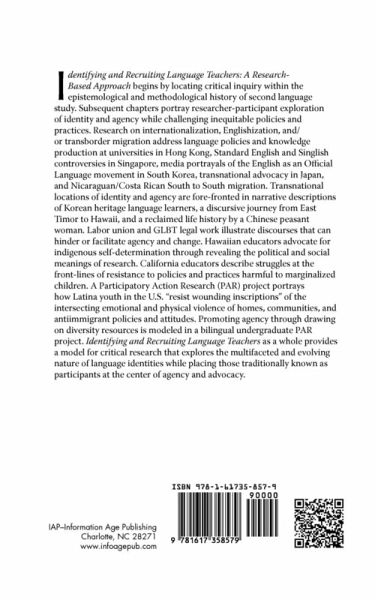 This volume begins by locating critical inquiry within the epistemological and methodological history of second language study. Subsequent chapters portray researcher-participant exploration of identity and agency while challenging inequitable policies and practices. Research on internationalization, Englishization, and/or transborder migration address language policies and knowledge production at universities in Hong Kong, Standard English and Singlish controversies in Singapore, media portrayals of the English as an Official Language movement in South Korea, transnational advocacy in Japan, and Nicaraguan/Costa Rican South to South migration. Transnational locations of identity and agency are fore-fronted in narrative descriptions of Korean heritage language learners, a discursive journey from East Timor to Hawaii, and a reclaimed life history by a Chinese peasant woman. Labor union and GLBT legal work illustrate discourses that can hinder or facilitate agency and change. Hawaiian educators advocate for indigenous self-determination through revealing the political and social meanings of research. California educators describe struggles at the front-lines of resistance to policies and practices harmful to marginalized children. A Participatory Action Research (PAR) project portrays how Latina youth in the U.S. "resist wounding inscriptions" of the intersecting emotional and physical violence of homes, communities, and antiimmigrant policies and attitudes. Promoting agency through drawing on diversity resources is modeled in a bilingual undergraduate PAR project. The volume as a whole provides a model for critical research that explores the multifaceted and evolving nature of language identities while placing those traditionally known as participants at the center of agency and advocacy.