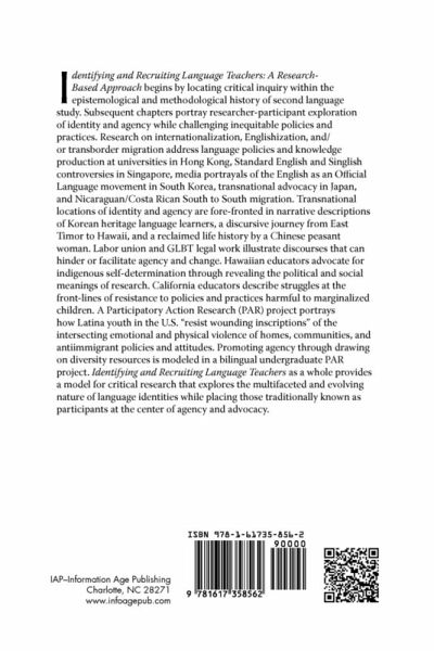 This volume begins by locating critical inquiry within the epistemological and methodological history of second language study. Subsequent chapters portray researcher-participant exploration of identity and agency while challenging inequitable policies and practices. Research on internationalization, Englishization, and/or transborder migration address language policies and knowledge production at universities in Hong Kong, Standard English and Singlish controversies in Singapore, media portrayals of the English as an Official Language movement in South Korea, transnational advocacy in Japan, and Nicaraguan/Costa Rican South to South migration. Transnational locations of identity and agency are fore-fronted in narrative descriptions of Korean heritage language learners, a discursive journey from East Timor to Hawaii, and a reclaimed life history by a Chinese peasant woman. Labor union and GLBT legal work illustrate discourses that can hinder or facilitate agency and change. Hawaiian educators advocate for indigenous self-determination through revealing the political and social meanings of research. California educators describe struggles at the front-lines of resistance to policies and practices harmful to marginalized children. A Participatory Action Research (PAR) project portrays how Latina youth in the U.S. "resist wounding inscriptions" of the intersecting emotional and physical violence of homes, communities, and antiimmigrant policies and attitudes. Promoting agency through drawing on diversity resources is modeled in a bilingual undergraduate PAR project. The volume as a whole provides a model for critical research that explores the multifaceted and evolving nature of language identities while placing those traditionally known as participants at the center of agency and advocacy.