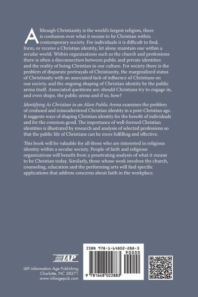 Although Christianity is the world's largest religion, there is confusion over what it means to be Christian within contemporary society. For individuals it is difficult to find, form, or receive a Christian identity, let alone maintain one within a secular world. Within organizations such as the church and professions there is often a disconnection between public and private identities and the reality of being Christian in our culture. For society there is the problem of disparate portrayals of Christianity, the marginalized status of Christianity with an associated lack of influence of Christians on our society, and the ongoing shaping of Christian identity by the public arena itself. Associated questions are: should Christians try to engage in, and even shape, the public arena and if so, how? Identifying as Christian in an Alien Public Arena examines the problem of confused and misunderstood Christian identity in a post-Christian age. It suggests ways of shaping Christian identity for the benefit of individuals and for the common good. The importance of well-formed Christian identities is illustrated by research and analysis of selected professions so that the public life of Christians can be more fulfilling and effective. This book will be valuable for all those who are interested in religious identity within a secular society. People of faith and religious organizations will benefit from a penetrating analysis of what it means to be Christian today. Similarly, those whose work involves the church, counseling, education and the performing arts will find specific applications that address concerns about faith in the workplace.