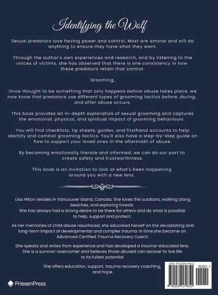 Identifying The Wolf Sexual predators love having power and control. Most are amoral and will do anything to ensure they have what they want. Through the author's own experiences and research, and by listening to the voices of victims, she has observed that there is one consistency in how these predators retain that control. Grooming. Once thought to be something that only happens before abuse takes place, we now know that predators use different types of grooming tactics before, during, and after abuse occurs. This book provides an in-depth exploration of sexual grooming and captures the emotional, physical, and spiritual impact of grooming behaviours. You will find checklists, tip sheets, guides, and firsthand accounts to help identify and combat grooming tactics. You'll also have a step-by-step guide on how to support your loved ones in the aftermath of abuse. By becoming emotionally literate and informed, we can do our part to create safety and trustworthiness. This book is an invitation to look at what's been happening around you with a new lens.
