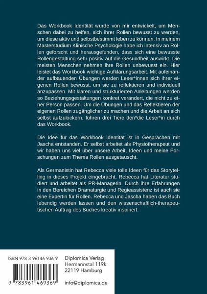 Ich bin Vanessa Ufert und habe das Workbook Identität entwickelt, um Menschen dabei zu helfen, sich ihrer Rollen bewusst zu werden, um diese aktiv und selbstbestimmt leben zu können. In meinem Masterstudium Klinische Psychologie habe ich intensiv an Rollen geforscht und herausgefunden, dass sich eine bewusste Rollengestaltung sehr positiv auf die Gesundheit auswirkt. Die meisten Menschen nehmen ihre Rollen unbewusst ein. Hier leistet das Workbook wichtige Aufklärungsarbeit. Mit aufeinander aufbauenden Übungen werden Leser_innen sich ihrer eigenen Rollen bewusst, um sie zu reflektieren und individuell anzupassen. Mit klaren und strukturierten Anleitungen werden so Beziehungsgestaltungen konkret verändert, die nicht zu einer Person passen. Um die Übungen und das Reflektieren der eigenen Rollen zugänglicher zu machen und die Arbeit an sich selbst aufzulockern, führen drei Tiere den_die Leser_in durch das Workbook.Die Idee für das Workbook Identität ist in Gesprächen mit Jascha Sand entstanden. Er selbst arbeitet als Physiotherapeut und wir haben uns viel über unsere Arbeit, Ideen und meine Forschungen zum Thema Rollen ausgetauscht. Als Germanistin hat Rebecca viele tolle Ideen für das Storytelling in dieses Projekt eingebracht. Rebecca hat Literatur studiert und arbeitet als PR-Managerin. Durch ihre Erfahrungen in den Bereichen Dramaturgie und Regieassistenz ist auch sie eine Expertin für Rollen. Rebecca und Jascha haben das Buch lebendig werden lassen und den wissenschaftlich-therapeutischen Auftrag des Buches kreativ inspiriert.