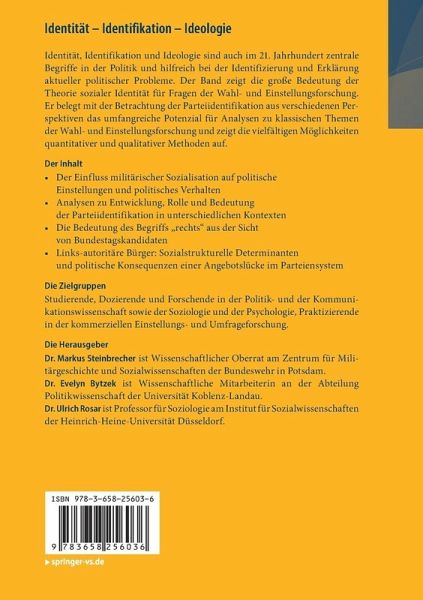 Die Schule der Nation für den Staatsbürger in Uniform? Der Einfluss militärischer Sozialisation auf politische Einstellungen und politisches Verhalten in Deutschland.- Parteiidentifikation und Alter: Eine empirische Analyse am Beispiel Hamburgs.- Soziale Identifikation vs. running tally: Der Einfluss des politischen Kontextes auf die Ausformung einer Parteiidentifikation.- The common grounds of adherence? A qualitative analysis of young partisans' collective identity.- "...Deutschland eben". Eine Analyse zur Interpretation des Begriffs "rechts" durch Bundestagskandidaten auf Grundlage von Structural Topic Models.- Links-autoritäre Bürger bei der Bundestagswahl 2013: Sozialstrukturelle Determinanten und Konsequenzen einer Angebotslücke für Wahlbeteiligung und Regimeunterstützung.