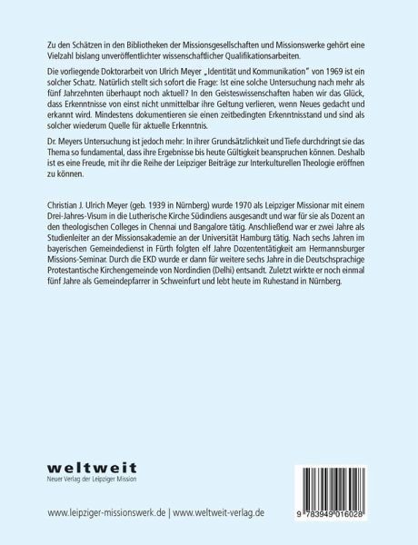 Zu den Schätzen in den Bibliotheken der Missionsgesellschaften gehört eine Vielzahl bislang unveröffentlichter wissenschaftlicher Qualifikationsarbeiten. Die vorliegende Doktorarbeit von C. J. Ulrich Meyer "Identität und Kommunikation" von 1969 ist ein solcher Schatz. Natürlich stellt sich sofort die Frage: Ist eine solche Untersuchung nach mehr als fünf Jahrzehnten überhaupt noch aktuell? In den Geisteswissenschaften haben wir das Glück, dass Erkenntnisse von einst nicht unmittelbar ihre Geltung verlieren, wenn Neues gedacht und erkannt wird. Mindestens dokumentieren sie einen zeitbedingten Erkenntnisstand und sind als solche wiederum Quelle für aktuelle Erkenntnis. Dr. Meyers Untersuchung ist jedoch mehr: In ihrer Grundsätzlichkeit und Tiefe durchdringt sie das Thema so fundamental, dass ihre Ergebnisse bis heute Gültigkeit beanspruchen können. Deshalb ist es eine Freude, mit ihr die Reihe der Leipziger Beiträge zur Interkulturellen Theologie erlffnen zu können.