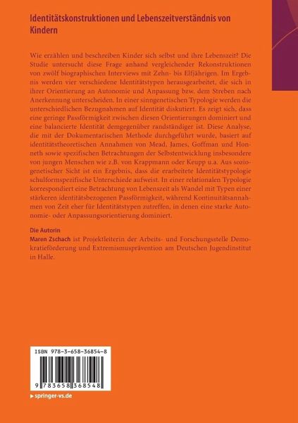 Wie erzählen und beschreiben Kinder sich selbst und ihre Lebenszeit? Die Studie untersucht diese Frage anhand vergleichender Rekonstruktionen von zwölf biographischen Interviews mit Zehn- bis Elfjährigen. Im Ergebnis werden vier verschiedene Identitätstypen herausgearbeitet, die sich in ihrer Orientierung an Autonomie und Anpassung bzw. dem Streben nach Anerkennung unterscheiden. In einer sinngenetischen Typologie werden die unterschiedlichen Bezugnahmen auf Identität diskutiert. Es zeigt sich, dass eine geringe Passförmigkeit zwischen diesen Orientierungen dominiert und eine balancierte Identität demgegenüber randständiger ist. Diese Analyse, die mit der Dokumentarischen Methode durchgeführt wurde, basiert auf identitätstheoretischen Annahmen von Mead, James, Goffman und Honneth sowie spezifischen Betrachtungen der Selbstentwicklung insbesondere von jungen Menschen wie z.B. von Krappmann oder Keupp u.a. Aus soziogenetischer Sicht ist ein Ergebnis, dass die erarbeitete Identitätstypologie schulformspezifische Unterschiede aufweist. In einer relationalen Typologie korrespondiert eine Betrachtung von Lebenszeit als Wandel mit Typen einer stärkeren identitätsbezogenen Passförmigkeit, während Kontinuitätsannahmen von Zeit eher für Identitätstypen zutreffen, in denen eine starke Autonomie- oder Anpassungsorientierung dominiert.