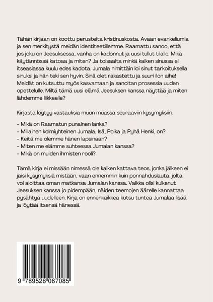 Tähän kirjaan on koottu perusteita kristinuskosta. Avaan evankeliumia ja sen merkitystä meidän identiteetillemme. Raamattu sanoo, että jos joku on Jeesuksessa, vanha on kadonnut ja uusi tullut tilalle. Mikä käytännössä katoaa ja miten? Ja toisaalta minkä kaiken sinussa ei itseasiassa kuulu edes kadota. Jumala nimittäin loi sinut tarkoituksella sinuksi ja hän teki sen hyvin. Sinä olet rakastettu ja suuri ilon aihe! Meidät on kutsuttu myös kasvamaan ja sanoitan prosessia uuden opettelulle. Miltä tämä uusi elämä Jeesuksen kanssa näyttää ja miten lähdemme liikkeelle? Kirjasta löytyy vastauksia muun muassa seuraaviin kysymyksiin: - Mikä on Raamatun punainen lanka? - Millainen kolmiyhteinen Jumala, Isä, Poika ja Pyhä Henki, on? - Keitä me olemme hänen lapsinaan? - Miten me elämme suhteessa Jumalan kanssa? - Mikä on muiden ihmisten rooli? Tämä kirja ei missään nimessä ole kaiken kattava teos, jonka jälkeen ei jäisi kysymyksiä mistään, vaan ennemmin kuin ponnahduslauta, jolta voi aloittaa oman matkansa Jumalan kanssa. Vaikka olisi kulkenut Jeesuksen kanssa jo pidempään, näiden teemojen äärelle kannattaa pysähtyä uudelleen. Kirja on ennenkaikkea kutsu tuntea Jumalaa lisää ja löytää itsensä hänessä.