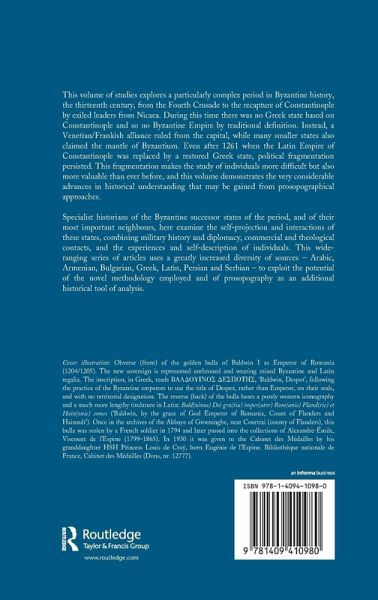 This volume explores a complex period in Byzantine history, the thirteenth century, from the Fourth Crusade to the recapture of Constantinople by exiled leaders from Nicaea. Here, specialist historians of the Byzantine successor states of the period, and of their key neighbours, examine the self-projection and interactions of these states, combining military history and diplomacy, commercial and theological contacts, and the experiences and self-description of individuals. This wide-ranging series of articles uses a great diversity of sources - Arabic, Armenian, Bulgarian, Greek, Latin, Persian and Serbian - to exploit the potential of the novel methodology employed and of prosopography as an additional historical tool of analysis.