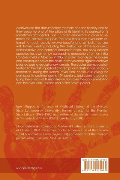 Archives are the documentary memory of each society and so they become one of the pillars of its identity. Its destruction is sometimes accidental, but it is often deliberate in order to remove the ties with the past. The new times that revolutions attempt to reach usually involve forceful and symbolic ruptures with former identity, including the destruction of the economic, administrative and historical documentation. This book collects updated texts written by outstanding researchers from an initial Congress held in Moscow in 2006 in order to analyze the causes and consequences of the destructive violence against archives boasted during revolutionary turmoils. The studies pay special attention to the first important contempt and destruction of documentation, during the French Revolution; continue studying the damages to archives during 19 th century; and culminated analyzing the effects of Russian Revolution over the documentation and the evolution until the end of the Soviet period.