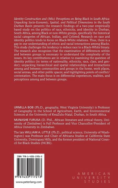Identity Construction and (Mis) Perceptions on Being Black in South Africa: Unpacking Socio-Economic, Spatial, and Political Dimensions in the South Durban Basin presents the research findings of a two-year empirically based study on the politics of race, ethnicity, and identity in Durban, South Africa, among Black or non-White groups, specifically the historical racial categories of African, Indian, and Colored. Research on race and identity politics tends to focus on Black-White relations. Thus, there is a gap in our understanding of ethnic and racial interactions among Blacks. This study challenges the tendency to reduce race to a Black-White binary. The research also recognizes that the examination of differences within and between groups is necessary to understand the complexity of the issues. Its key contributions are in relation to examining the question of identity politics (in terms of nationality, ethnicity, race, class, and gender); unpacking hierarchical and spatial relationships and interactions among and between communities and groups in the home, work places, social arenas, and other public spaces; and highlighting points of conflict/contestation. The main focus is on differential experiences, realities, and perceptions among and between groups.