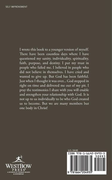 I wrote this book to a younger version of myself. There have been countless days where I have questioned my sanity, individuality, spirituality, faith, purpose, and destiny. I put my trust in people who failed me. I believed in people who did not believe in themselves. I have cried and wanted to give up. But God has been faithful. Just when I thought it was over... God stepped in right on time and delivered me out of my pit. I pray the testimonies I share with you will enable and strengthen your relationship with God. It is not up to us individually to be who God created us to become. But we are many members but one body in Christ!