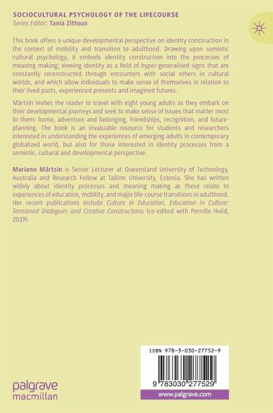 This book offers a unique developmental perspective on identity construction in the context of mobility and transition to adulthood. Drawing upon semiotic cultural psychology, it embeds identity construction into the processes of meaning making; viewing identity as a field of hyper-generalised signs that are constantly reconstructed through encounters with social others in cultural worlds, and which allow individuals to make sense of themselves in relation to their lived pasts, experienced presents and imagined futures.