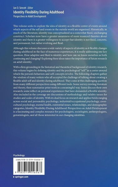Contents.- Preface.- Part One: Concepts of Identity.- 1.On the Stability of Identity Interacting with the Impermanence of Time Evangeline A. Wheeler.- 2. Cognitive Underpinnings of Identity Flexibility in Adulthood Jan D. Sinnott.- Part Two: Research, Theory, Personal Experiences.- 3. Identity Flexibility and Wisdom in Adulthood: The Roles of a Growth-Oriented Identity Style and Contemplative Processes Sherry L. Beaumont.- 4. In Experiential Exploration of Identity during Emerging Adulthood: The Impact of Growth Experiences on Emerging Adulthood Characteristics Luke Boardman.- 5. Bridging the Gap: Black Immigrant Identities and Dreams of Home Leonie J. Brooks.- 6. Flexibility in Persons with Dementia Cameron J. Camp.- 7. Spirituality as a Framework for Confronting Life's Existential Questions in Later Adulthood John C. Cavanaugh.- 8. Rural-urban Migration, Quality of Life, and Identity Commitments among Badaga People of South India Gareth Davey.- 9. The Concurrent Paths of ParentalIdentity and Child Development Maria P. Fracasso.- 10. "Like a Constantly Flowing River": Gender Identity Flexibility among Non-binary Transgender Individuals M. Paz Galupo, Lexi K. Pulice-Farrow, and Johanna L. Ramirez.- 11. Identity Stories to Jettison Louise Green.- 12. Work and Identity Flexibility Carol Hoare.- 13. Moving from Student to Professional Shaina A. Kumar.- 14. Play, Flow, and Tailoring Identity in Middle Adulthood Kevin Rathunde and Russell Isabella.- 15. Optimizing Challenges: Eminent Elders Meet Adversity with Identity Flexibility Grant J. Rich.- 16. Identity Flexibility and Buddhism Jeff Rosenberg.- 17. Identity Revised: A Clinician's Perspective on what an Identity-based Model of Mind Looks Like Vedat Sar.- 18. Caregiving Identity and Flexibility Kim Shifren.- 19. Dual Identities and the Artist Valerie Smith.- 20. The Sick Self Betsey Stellhorn.- 21. "Just When I Knew All of Life's Answers, They Changed the Questions": A Eudaimonist Perspective on Identity Flexibility During the Adult Years Alan S. Waterman.