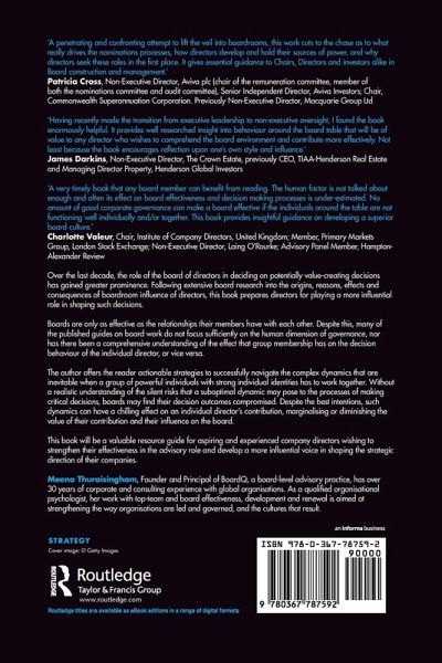 Over the last decade, the role of the board of directors in deciding on potentially value-creating decisions has gained greater prominence. Following extensive board research into the origins, reasons, effects and consequences of boardroom influence of directors, this book prepares directors for playing a more influential role in shaping such decisions. Boards are only as effective as the relationships their members have with each other. Despite this, many of the published guides on board work do not focus sufficiently on the human dimension of governance, nor has there been a comprehensive understanding of the effect that group membership has on the decision behaviour of the individual director, or vice versa. The author offers the reader actionable strategies to successfully navigate the complex dynamics that are inevitable when a group of powerful individuals with strong individual identities has to work together. Without a realistic understanding of the silent risks that a suboptimal dynamic may pose to the processes of making critical decisions, boards may find their decision outcomes compromised. Despite the best intentions, such dynamics can have a chilling effect on an individual director's contribution, marginalising or diminishing the value of their contribution and their influence on the board. This book will be a valuable resource guide for aspiring and experienced company directors wishing to strengthen their effectiveness in the advisory role and develop a more influential voice in shaping the strategic direction of their companies.