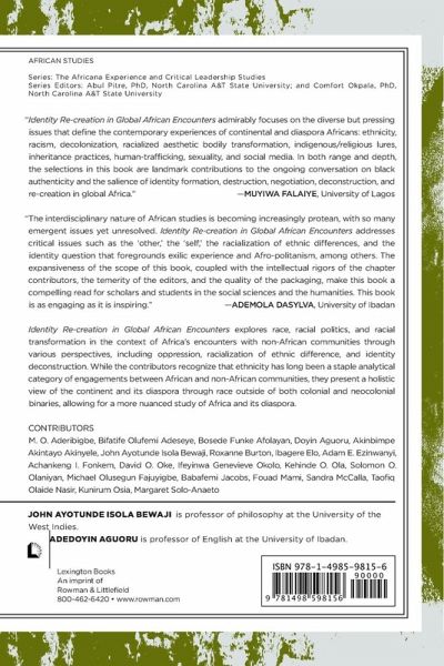 Chapter One: Race and Ethnicity: Irreducible Categories in Black People's Encounters Chapter Two: The Concept of Common Origin and the Question of Racism Chapter Three: Apartheid and Beyond: An Exploration of South African Drama Chapter Four: British Southern Cameroons' Restoration of Statehood & Sovereignty Internal Affair or Decolonization Conflict? Chapter Five: Eurocentrism, 'African Art' and the 'Egypt' Factor Chapter Six: Aesthetics of Indigenous Faith Tourism in Africa and the Diaspora Chapter Seven: Racialized Beauty: the Case of Skin Bleaching as an Identity Crisis for Non-Whites Chapter Eight: Towards Utilizing the Social Media in Sustaining African Culture and Identity Chapter Nine: Social Media Transcending Longstanding Stereotypes? Chimamanda Ngozi Adichie's Americanah and Belkacem Meghzouchene's Sophia in the White City as a Case in Point Chapter Ten: Universal Adaptability of the Affective Essence of Ifa Lore in the Stage Presentation of Ola Rotimi's The Gods are not to blame Chapter Eleven: Colonialism and Home-grown Businesses in Africa Chapter Twelve: Post-colonialism and the Emergent Political Culture in Africa: A Literary Study of Ngugi WaThiong'O's Fictional Work Chapter Thirteen: The Body in Personal Identity Development Chapter Fourteen: Sexual Predators or Preys: The White Male in Jude Dibia's Novels Chapter Fifteen: Human Trafficking in Ifeanyi Ajaegbo's Sarah House Chapter Sixteen: Representation of Human Trafficking in Ifeoma Chinwuba's Merchants of Flesh Chapter Seventeen: Cultural Crisis of Widowhood Inheritance and Maltreatment in African Society