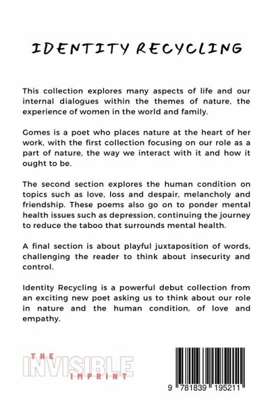 This collection explores many aspects of life and our internal dialogues within the themes of nature, the experience of women in the world and family. Gomes is a poet who places nature at the heart of her work, with the first collection focusing on our role as a part of nature, the way we interact with it and how it ought to be. The second section explores the human condition on topics such as love, loss and despair, melancholy and friendship. These poems also go on to ponder mental health issues such as depression, continuing the journey to reduce the taboo that surrounds mental health. A final section is about playful juxtaposition of words, challenging the reader to think about insecurity and control. Identity Recycling is a powerful debut collection from an exciting new poet asking us to think about our role in nature and the human condition, of love and empathy.