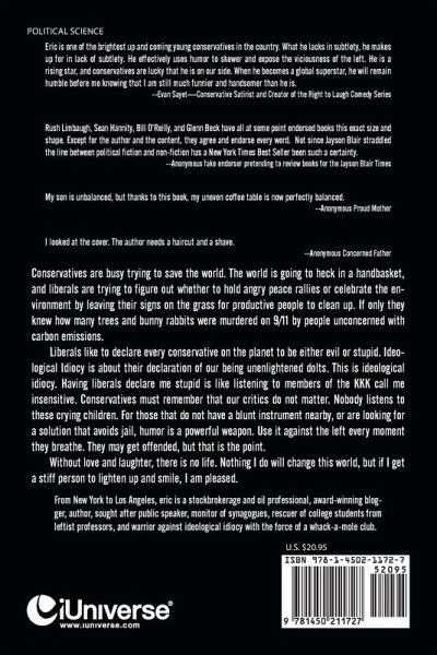 Conservatives are busy trying to save the world. The world is going to heck in a handbasket, and liberals are trying to figure out whether to hold angry peace rallies or celebrate the environment by leaving their signs on the grass for productive people to clean up. If only they knew how many trees and bunny rabbits were murdered on 9/11 by people unconcerned with carbon emissions. Liberals like to declare every conservative on the planet to be either evil or stupid. Ideological Idiocy is about their declaration of our being unenlightened dolts. This is ideological idiocy. Having liberals declare the author stupid is like listening to members of the KKK call him insensitive. Conservatives must remember that our critics do not matter. Nobody listens to these crying children. For those that do not have a blunt instrument nearby, or are looking for a solution that avoids jail, humor is a powerful weapon. Use it against the left every moment they breathe. They may get offended, but that is the point. The only thing that the author wants to communicate in this book is that without love and laughter, there is no life. Nothing he does will change the world, but if it gets a stiff person to lighten up and smile, he is pleased.
