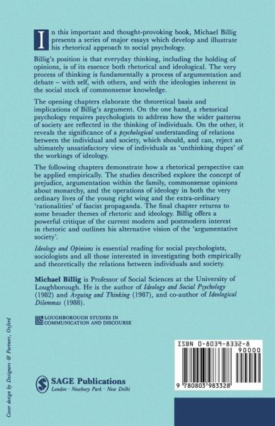 In this thought-provoking book, Billig presents major essays which develop and illustrate his rhetorical approach to social psychology. His position is that everyday thinking, including the holding of opinions, is of its essence both rhetorical and ideological. The very process of thinking is a process of argumentation and debate - with self, with others and with the ideologies inherent in the social stock of commonsense knowledge. Following an elaboration of the theoretical basis and implications of his argument, the author demonstrates how a rhetorical perspective can be applied empirically. He explores the concept of prejudice, argumentation within the family, commonsense opinions about monarchy and the operations of ideology in both the very ordinary lives of the young right-wing and the extra-ordinary `rationalities' of fascist propaganda. The final chapter returns to broader themes of rhetoric and ideology. Billig offers a powerful critique of the current modern and postmodern interest in rhetoric and outlines his alternative vision of the `argumentative society'.