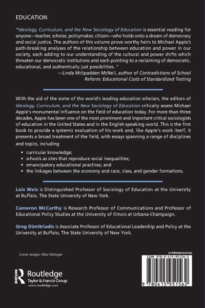 Introduction. Ideology Curriculum and the New Sociology of Education: Revisiting the Work of Michael Apple Greg Dimitriadis Lois Weis and Cameron McCarthy Section One: Revisiting the New Sociology of Education 1. Retrieving the Ideological Past: Critical Sociology Gender Theory and the School Curriculum 2. Social Class School Knowledge and the Hidden Curriculum: Re-Theorizing Reproduction 3. Schooling Power and the Exile of the Soul Section Two: Contemporary Theoretical Challenges 4. Riding Tensions Critically: Ideology Power/Knowledge and Curriculum Making 5. Are We Making Progress?: Ideology and Curriculum in the Age of "No Child Left Behind" 6. Teaching After the Market: From Commodity to Cosmopolitan Section Three: On Spaces of Possibility 7. Contesting Research Rearticulation and "Thick Democracy" as Political Projects of Method 8. [Re]visioning Knowledge Politics and Change: Educational Poetics 9. Situating Education: Michael Apple's Scholarship and Political Commitment in the Brazilian Context. Afterword. Critical Education Politics and the Real World