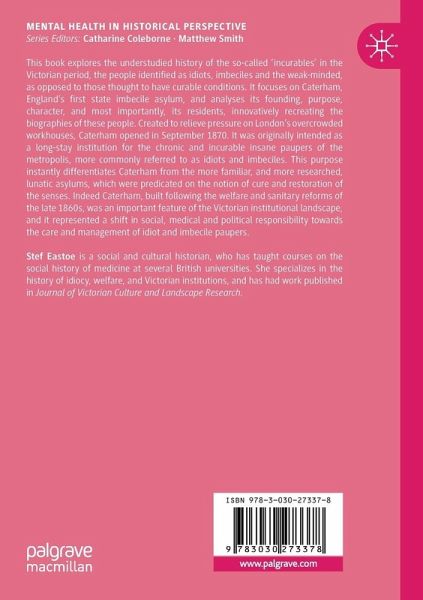 This book explores the understudied history of the so-called 'incurables' in the Victorian period, the people identified as idiots, imbeciles and the weak-minded, as opposed to those thought to have curable conditions. It focuses on Caterham, England's first state imbecile asylum, and analyses its founding, purpose, character, and most importantly, its residents, innovatively recreating the biographies of these people. Created to relieve pressure on London's overcrowded workhouses, Caterham opened in September 1870. It was originally intended as a long-stay institution for the chronic and incurable insane paupers of the metropolis, more commonly referred to as idiots and imbeciles. This purpose instantly differentiates Caterham from the more familiar, and more researched, lunatic asylums, which were predicated on the notion of cure and restoration of the senses. Indeed Caterham, built following the welfare and sanitary reforms of the late 1860s, was an important feature of the Victorian institutional landscape, and it represented a shift in social, medical and political responsibility towards the care and management of idiot and imbecile paupers.