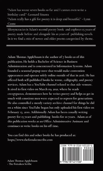 Idiosyncrasies is the second poetry book written by Author Adam Thomas Applebaum and his 7th Book Published to date. Take a deep dive into the amalgamation of 15 years of casually writing poetry and 10 years of Independent Publishing. In it you should find a mixture of poems of multiple themes from the introspective to the spiritual, and funny. There are also poems about Work and Routine, Perseverance, and Love and Loss to name just a few other topics the book touches on. For this celebration of 10 years of independent publishing you can also find some short stories he felt were worth showing as they tell a narrative not unlike what he aims to convey in poem form. For the especially dedicated why not read chapter 10 and find out just what sorts of madness was going on in his mind or added context to some of his more unusual poems. Not doing so should not detract from the experience as he knows some prefer to be kept in the dark about it.