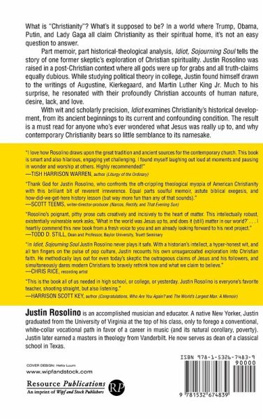 What is ""Christianity""? What's it supposed to be? In a world where Trump, Obama, Putin, and Lady Gaga all claim Christianity as their spiritual home, it's not an easy question to answer. Part memoir, part historical-theological analysis, Idiot, Sojourning Soul tells the story of one former skeptic's exploration of Christian spirituality. Justin Rosolino was raised in a post-Christian context where all gods were up for grabs and all truth-claims equally dubious. While studying political theory in college, Justin found himself drawn to the writings of Augustine, Kierkegaard, and Martin Luther King Jr. Much to his surprise, he resonated with their profoundly Christian accounts of human nature, desire, lack, and love. With wit and scholarly precision, Idiot examines Christianity's historical development, from its ancient beginnings to its current and confounding condition. The result is a must read for anyone who's ever wondered what Jesus was really up to, and why contemporary Christianity bears so little semblance to its namesake.