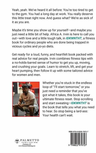 Get real, get moving, and get fit with IDKWNTHT, the no-BS fitness guide that calls out your excuses and gets you on track to crushing your health goals. Are you tired of making promises that you'll start getting in shape, only to fall through on your commitments? Sick of scrolling through influencers on social media who make it look easy while you're stuck in the same yo-yo diet cycle? How about you get up off your ass, then? IDKWNTHT (I Don't Know Who Needs to Hear This) is the wake-up call you didn't know you needed. Written by U.S. Army combat veteran Africa A. Irvin, this hilarious and brutally honest fitness book breaks down barriers, excuses, and comfort zones to get you living your best life. With a unique blend of tough love and practical advice, this book tackles all the reasons you won't show up for yourself, instilling a vigor and determination that will inspire you to break the glass ceiling on your goals. Readers will get detailed breakdowns of exercises and routines, from stretching to lifting to cardio, including chapters on men's and women's focal areas. There's no sugar coating, no filler here-just BS-free, actionable advice packed with motivation and a great sense of humor. Whether you're on-again, off-again or someone who just signed up for a gym membership and haven't been since your first two weeks, get ready to move with this powerful book that lets you take back your body for years to come.