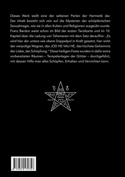 Dieses Werk stellt eine der seltenen Perlen der Hermetik dar. Der Inhalt bezieht sich rein auf die Mysterien der schöpferischen Sexualmagie, wie sie in allen Kulten und Religionen ausgeübt wurde. Franz Bardon weist schon im Bild der ersten Tarotkarte und im 10. Kapitel über die Ladung von Talismanen mit dem Satz daraufhin: "Es wird hier der untere wie obere Doppelpol in Kraft gesetzt, hier wirkt der vierpolige Magnet, das JOD HE VAU HE, das höchste Geheimnis der Liebe, der Schöpfung." Diese heiligen Feste wurden in dafür extra vorbereiteten Räumen - Tempelanlagen der Götter - durchgeführt, mit dessen Hilfe man alles Schöpfen, Erhalten und Vernichten kann.