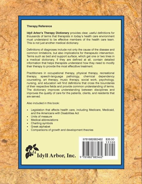There are four great medical dictionaries, but they do not cover therapy issues as well as Idyll Arbor's Therapy Dictionary. While we realize that we have a long way to go to be as complete in terms of number of entries and coverage of medical terms, there are issues of therapy where our definitions are far more informative and complete. We believe that we are the best therapy dictionary available today. For example, see our definitions for beds and support surfaces. Considerations that really make a difference for therapeutic treatment are covered there in ways that none of the medical dictionaries attempt. Check the definition of mental retardation for the depth of information that is vital to a therapist who is providing treatment. There are many other examples of definitions that include implications for functional ability, emotional health, and therapy interventions, which cannot be found in any of the medical dictionaries. The book also contains extensive cross-referencing to help the reader better understand the meanings of words. There are six appendices in the book including medical abbreviations, units of measure, root word analytical list, miscellaneous medical symbols, Greek alphabet, and growth and development theories. We don't think that Idyll Arbor's Therapy Dictionary can replace any of the current medical dictionaries, but we think that it deserves a place on the shelf beside them.
