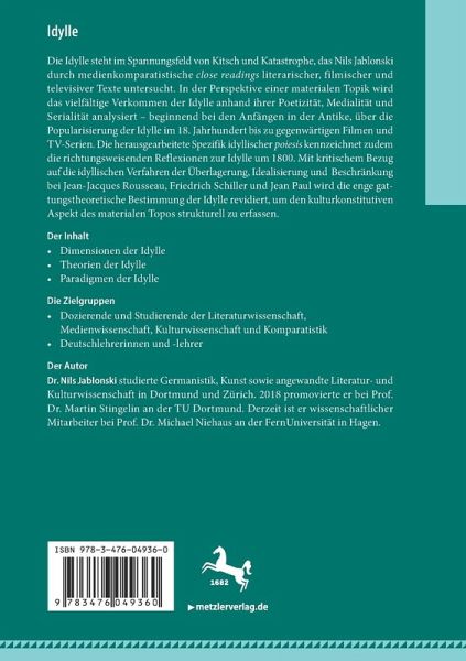 Die Idylle steht im Spannungsfeld von Kitsch und Katastrophe, das Nils Jablonski durch medienkomparatistische close readings literarischer, filmischer und televisiver Texte untersucht. In der Perspektive einer materialen Topik wird das vielfältige Verkommen der Idylle anhand ihrer Poetizität, Medialität und Serialität analysiert - beginnend bei den Anfängen in der Antike, über die Popularisierung der Idylle im 18. Jahrhundert bis zu gegenwärtigen Filmen und TV-Serien. Die herausgearbeitete Spezifik idyllischer poiesis kennzeichnet zudem die richtungsweisenden Reflexionen zur Idylle um 1800. Mit kritischem Bezug auf die idyllischen Verfahren der Überlagerung, Idealisierung und Beschränkung bei Jean-Jacques Rousseau, Friedrich Schiller und Jean Paul wird die enge gattungstheoretische Bestimmung der Idylle revidiert, um den kulturkonstitutiven Aspekt des materialen Topos strukturell zu erfassen.