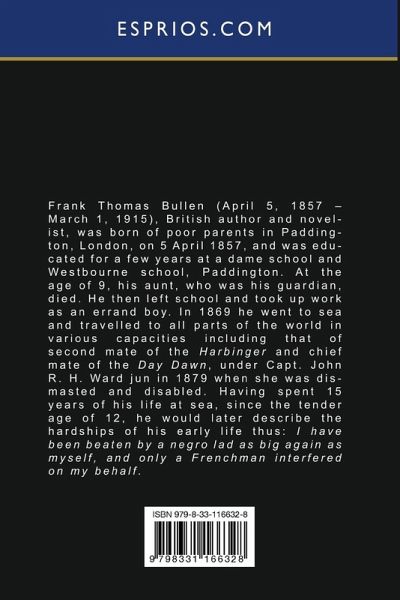 Frank Thomas Bullen (April 5, 1857 - March 1, 1915), British author and novelist, was born of poor parents in Paddington, London, on 5 April 1857, and was educated for a few years at a dame school and Westbourne school, Paddington. At the age of 9, his aunt, who was his guardian, died. He then left school and took up work as an errand boy. In 1869 he went to sea and travelled to all parts of the world in various capacities including that of second mate of the Harbinger and chief mate of the Day Dawn, under Capt. John R. H. Ward jun in 1879 when she was dismasted and disabled. Having spent 15 years of his life at sea, since the tender age of 12, he would later describe the hardships of his early life thus: I have been beaten by a negro lad as big again as myself, and only a Frenchman interfered on my behalf.