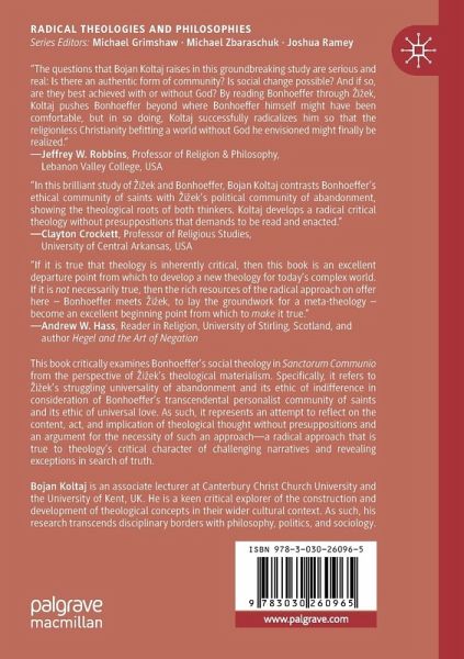 This book critically examines Bonhoeffer's social theology in Sanctorum Communio from the perspective of Zizek's theological materialism. Specifically, it refers to Zizek's struggling universality of abandonment and its ethic of indifference in consideration of Bonhoeffer's transcendental personalist community of saints and its ethic of universal love. As such, it represents an attempt to reflect on the content, act, and implication of theological thought without presuppositions and an argument for the necessity of such an approach-a radical approach that is true to theology's critical character of challenging narratives and revealing exceptions in search of truth.