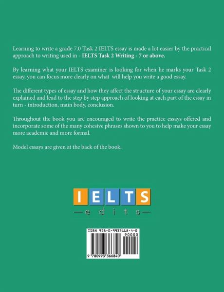 Learning to write a grade 7.0 Task 2 IELTS essay is made a lot easier by the practical approach to writing used in - IELTS Task 2 Writing - 7 or above. By learning what your IELTS examiner is looking for when he marks your Task 2 essay, you can focus more clearly on what will help you write a good essay. The different types of essay and how they affect the structure of your essay are clearly explained and lead to the step by step approach of looking at each part of the essay in turn - introduction, main body, and conclusion. Throughout the book you are encouraged to write the practice essays offered and incorporate some of the many cohesive phrases shown to you to help make your essay more academic and more formal. Model essays are given at the back of the book.