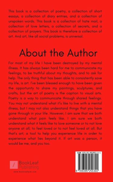 This book is a collection of poetry, a collection of short essays, a collection of diary entries, and a collection of unspoken words. This book is a collection of hate mail, a collection of love letters, a collection of secrets, and a collection of prayers. This book is therefore a collection of art. And art, like all social problems, is universal.