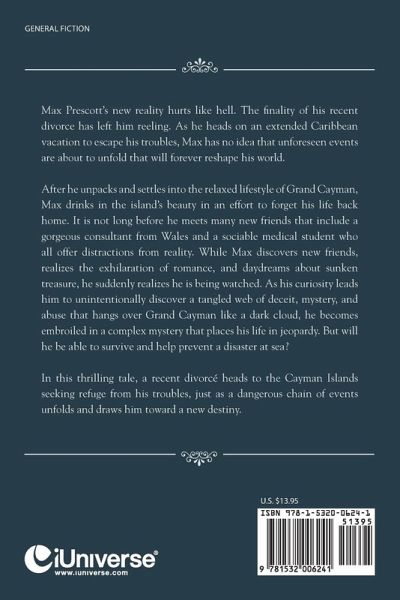 Max Prescott’s new reality hurts like hell. The finality of his recent divorce has left him reeling. As he heads on an extended Caribbean vacation to escape his troubles, Max has no idea that unforeseen events are about to unfold that will forever reshape his world. After he unpacks and settles into the relaxed lifestyle of Grand Cayman, Max drinks in the island’s beauty in an effort to forget his life back home. It is not long before he meets many new friends that include a gorgeous consultant from Wales and a sociable medical student who all offer distractions from reality. While Max discovers new friends, realizes the exhilaration of romance, and daydreams about sunken treasure, he suddenly realizes he is being watched. As his curiosity leads him to unintentionally discover a tangled web of deceit, mystery, and abuse that hangs over Grand Cayman like a dark cloud, he becomes embroiled in a complex mystery that places his life in jeopardy. But will he be able to survive and help prevent a disaster at sea? In this thrilling tale, a recent divorcé heads to the Cayman Islands seeking refuge from his troubles, just as a dangerous chain of events unfolds and draws him toward a new destiny.