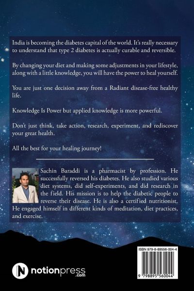 India is becoming the diabetes capital of the world. It's really necessary to understand that type 2 diabetes is actually curable and reversible. By changing your diet and making some adjustments in your lifestyle, along with a little knowledge, you will have the power to heal yourself. You are just one decision away from a Radiant disease-free healthy life. Knowledge Is Power but applied knowledge is more powerful. Don't just think, take action, research, experiment, and rediscover your great health. All the best for your healing journey!