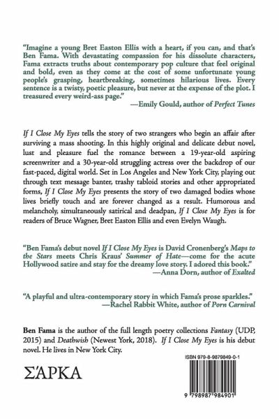 In a debut novel as emotionally raw as it is uncanny, a tragic love story unfolds against the complicated backdrop of Hollywood's elite, where the line between reality and fantasy blurs under the modern tension of the civilian and celebrity worlds. Deathwish and Fantasy author Ben Fama brings a poet's sensibility to his highly original and delicate debut novel. If I Close My Eyes showcases Fama's demonstrated skill for startling visual imagery, emotional depth and caustic satire, all woven into a tragic narrative as real as it is otherworldly. The novel tells the story of two strangers who begin an affair after surviving a mass shooting at a Kim Kardashian book signing. Lust and pleasure fuel the romance between a 19-year-old aspiring screenwriter and a 30-year-old struggling actress over the backdrop of our fast-paced, digital world. Set in Los Angeles and New York City, playing out through text message banter, trashy tabloid stories and other appropriated forms, If I Close My Eyes presents the story of two damaged bodies whose lives briefly touch and are forever changed as a result. Humorous and melancholy, simultaneously satirical and deadpan, If I Close My Eyes is for readers of Bruce Wagner, Bret Easton Ellis and even Evelyn Waugh. A true poet's novel, beautiful yet deliberate, If I Close My Eyes comes undone with each turn of the page, peeling back every artifice facing us and showing us ourselves, stripped of our narratives, naked except for our desires. Fama pulls us into his spiral with ease, offering humor and devastation with each card dealt to us, and the chaos feels as intrinsic yet mysterious to us as our own bodies. If I Close My Eyes makes us question: What do we do when fantasy abandons us? "Imagine a young Bret Easton Ellis with a heart, if you can, and that's Ben Fama. With devastating compassion for his dissolute characters, Fama extracts truths about contemporary pop culture that feel original and bold, even as they come at the cost of some unfortunate young people's grasping, heartbreaking, sometimes hilarious lives. Every sentence is a twisty, poetic pleasure, but never at the expense of the plot. I treasured every weird-ass page." -Emily Gould, author of Perfect Tunes "Ben Fama's debut novel If I Close My Eyes is David Cronenberg's Maps to the Stars meets Chris Kraus' Summer of Hate-come for the acute Hollywood satire and stay for the dreamy love story. I adored this book." -Anna Dorn, author of Exalted "A playful and ultra-contemporary story in which Fama's prose sparkles." -Rachel Rabbit White, author of Porn Carnival "A thoughtful ... vivid tale." -Kirkus