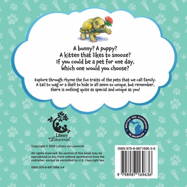A bunny? A puppy? A kitten that likes to snooze? If you could be a pet for one day, Which one would you choose? Explore through rhyme the fun traits of the pets that we call family. A tail to wag or a shell to hide in all seem so unique, but remember, there is nothing quite as special and unique as you! Do you know a young animal lover who is ready to continue their literature journey? This book will surely be a hit! Geared toward preschool and elementary age children, this uplifting short rhyming story and vibrantly illustrated book will captivate children of all ages while strengthening key reading skills. This book is made of the best quality board book, allowing our young readers to fully enjoy their journey through literature. Our books feature: rounded corners for safety matte lamination for durability lightweight for transportation colorful illustrations for engagement rhyming words for phonemic fluency thick pages for the dexterity of our young readers.