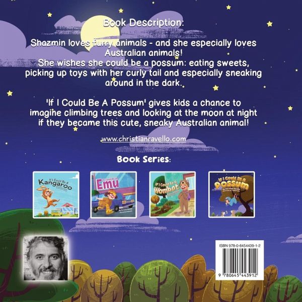 Shazmin loves furry animals - and she especially loves Australian animals! She wishes she could be a possum: eating sweets, picking up toys with her curly tail and especially sneaking around in the dark. 'If I Could Be A Possum' gives kids a chance to imagine climbing trees and looking at the moon at night if they became this cute, sneaky Australian animal!
