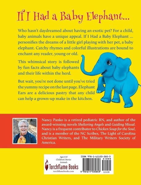 If I had a baby elephant, she'd have a special nose. I don't want a cat or dog, everyone has those. What would you do if you had a baby elephant as a pet? This charming book with catchy rhymes and colorful illustrations explores the possibilities from the perspective of one little girl dreaming about what she would do if she had a baby elephant. This whimsical story is followed by fun facts about baby elephants and their life within the herd, as well as a yummy recipe for delicious Elephant Ear pastries that children can help their grown-ups make in the kitchen.
