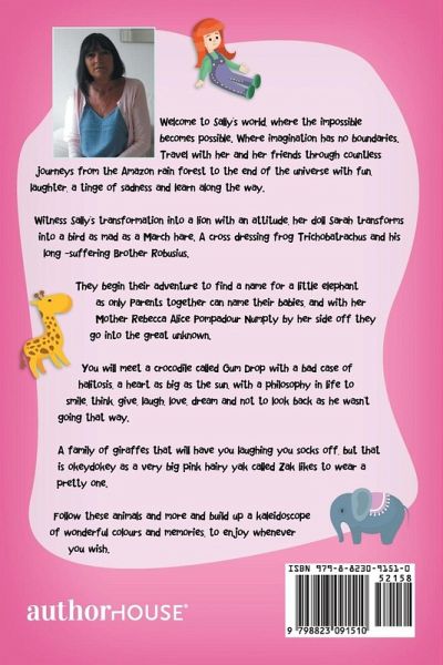 Welcome to Sally's world, where the impossible becomes possible. Where imagination has no boundaries. Travel with her and her friends through countless journeys from the Amazon rain forest to the end of the universe with fun, laughter, a tinge of sadness and learn along the way. Witness Sally's transformation into a lion with an attitude, her doll Sarah transforms into a bird as mad as a March hare. A cross dressing frog Trichobatrachus and his long -suffering Brother Robusius. They begin their adventure to find a name for a little elephant as only Parents together can name their babies, and with her Mother Rebecca Alice Pompadour Numpty by her side off they go into the great unknown. You will meet a crocodile called Gum Drop with a bad case of halitosis, a heart as big as the sun, with a philosophy in life to smile, think, give, laugh, love, dream and not to look back as he wasn't going that way. A family of giraffes that will have you laughing you socks off, but that is okeydokey as a very big pink hairy yak called Zak likes to wear a pretty one. Follow these animals and more and build up a kaleidoscope of wonderful colours and memories, to enjoy whenever you wish.