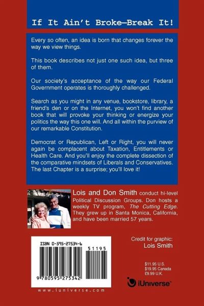 Every so often, an idea is born that changes forever the way we view things. This book describes not just one such idea, but three of them. Our society's acceptance of the way our Federal Government operates is thoroughly challenged. Search as you might in any venue, bookstore, library, a friend's den or on the Internet, you won't find another book that will provoke your thinking or energize your politics the way this one will. And all within the purview of our remarkable Constitution. Democrat or Republican, Left or Right, you will never again be complacent about Taxation, Entitlements or Health Care. And you'll enjoy the complete dissection of the comparative mindsets of Liberals and Conservatives. The last Chapter is a surprise; you'll love it!