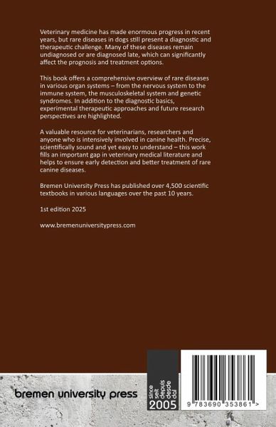 Veterinary medicine has made enormous progress in recent years, but rare diseases in dogs still present a diagnostic and therapeutic challenge. Many of these diseases remain undiagnosed or are diagnosed late, which can significantly affect the prognosis and treatment options. This book offers a comprehensive overview of rare diseases in various organ systems - from the nervous system to the immune system, the musculoskeletal system and genetic syndromes. In addition to the diagnostic basics, experimental therapeutic approaches and future research perspectives are highlighted. A valuable resource for veterinarians, researchers and anyone who is intensively involved in canine health. Precise, scientifically sound and yet easy to understand - this work fills an important gap in veterinary medical literature and helps to ensure early detection and better treatment of rare canine diseases. Bremen University Press has published over 4,500 scientific textbooks in various languages over the past 10 years.