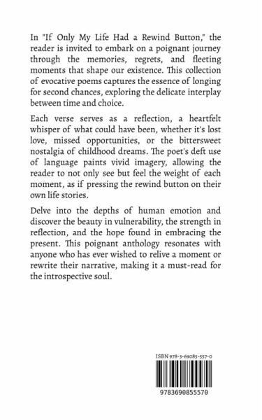 In "If Only My Life Had a Rewind Button," the reader is invited to embark on a poignant journey through the memories, regrets, and fleeting moments that shape our existence. This collection of evocative poems captures the essence of longing for second chances, exploring the delicate interplay between time and choice. Each verse serves as a reflection, a heartfelt whisper of what could have been, whether it's lost love, missed opportunities, or the bittersweet nostalgia of childhood dreams. The poet's deft use of language paints vivid imagery, allowing the reader to not only see but feel the weight of each moment, as if pressing the rewind button on their own life stories. Delve into the depths of human emotion and discover the beauty in vulnerability, the strength in reflection, and the hope found in embracing the present. This poignant anthology resonates with anyone who has ever wished to relive a moment or rewrite their narrative, making it a must-read for the introspective soul.