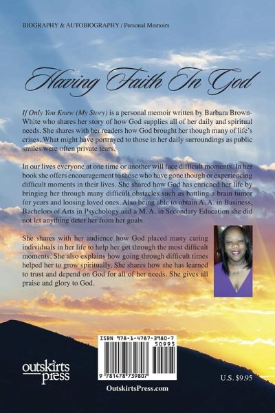 If Only You Knew (My Story) is a personal memoir written by Barbara Brown-White who shares her story of how God supplies all of her daily and spiritual needs. She shares with her readers how God brought her though many of life's crises. What might have portrayed to those in her daily surroundings as public smiles were often private tears. In our lives everyone at one time or another will face difficult moments. In her book she offers encouragement to those who have gone though or experiencing difficult moments in their lives. She shared how God has enriched her life by bringing her through many difficult obstacles such as battling a brain tumor for years and loosing loved ones. Also being able to obtain A. A. in Business, Bachelors of Arts in Psychology and a M. A. in Secondary Education she did not let anything deter her from her goals. She shares with her audience how God placed many caring individuals in her life to help her get through the most difficult moments. She also explains how going through difficult times helped her to grow spiritually. She shares how she has learned to trust and depend on God for all of her needs. She gives all praise and glory to God.